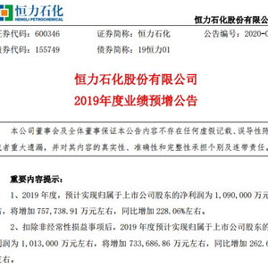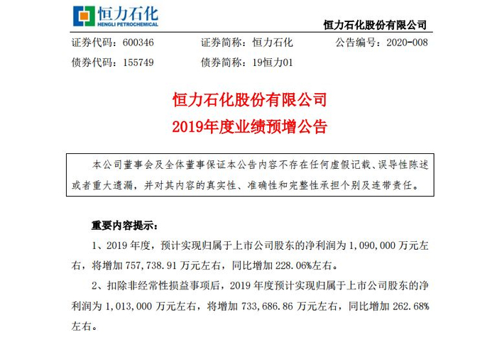 1月17日,国内石化巨头 恒力石化 向市场发布了2019年度业绩预增公告。数据显示:恒力石化2019年度预计实现净利润109亿元,盈利首次突破百亿元大关,利润相比2018年33.23亿元,同比大幅增长228%,远超各方预期水平。