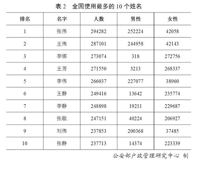 全国户籍人口中,使用频率最高的10个姓名依次为:“张伟”“王伟”“李娜”“王芳”“李伟”“王静”“李静”“张敏”“刘伟”“张静”。这些姓名男女皆有使用。