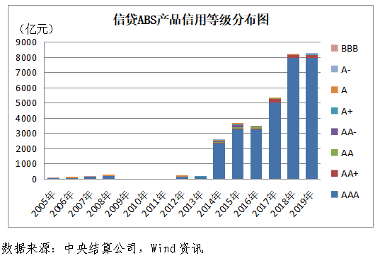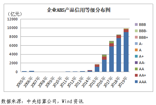 2019年发行的资产证券化产品仍以高信用等级产品为主。信贷ABS产品中,AA级及以上高等级产品发行额为8187.75亿元,占信贷ABS发行总量的85%;企业ABS产品中,AA级及以上高等级产品发行额为9756.83亿元,占企业ABS发行总量的89%。