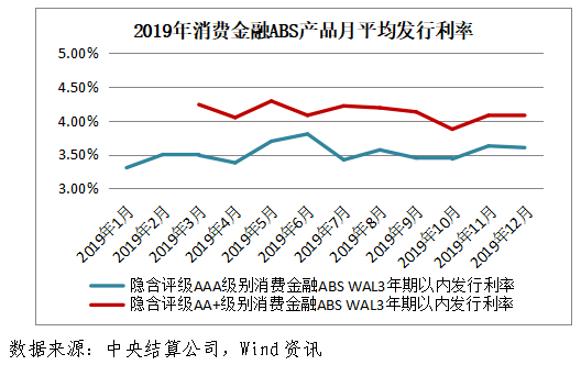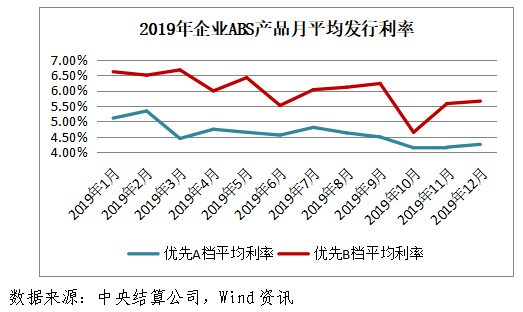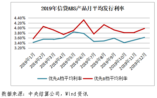 2019年资产证券化产品的发行利率出现分化,其中信贷ABS的发行利率小幅上行,企业ABS的发行利率震荡下行。