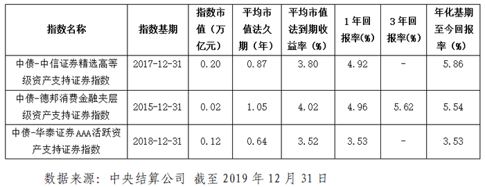 此外,中债金融估值中心与市场机构开展合作,发布了三只ABS定制化指数。其中,“中债-中信证券精选高等级资产支持证券指数”由中信证券精选待偿期在0.5年和2年之间且债项评级为AAA的资产支持证券及资产支持票据作为指数成分券;