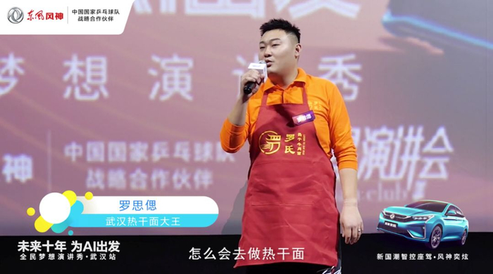 此外,东风风神围绕品牌「追梦新青年」精神在线下举办了两场“未来十年为AI出发”全民梦想演讲秀”和一场盛典,其中在武汉站的全民梦想演讲秀就有邀请微电影人物原型——热干面大王罗思偲,到场与大众分享他自己的追梦故事:初中毕业的他为了减轻家里的负担,偶然间踏入热干面的世界,日复一日反复的钻研打磨热干面的每个做法细节,罗思偲最终做出了令自己满意的一碗面,也收获了自己的爱情,在妻子的付出陪伴下,一步步创立起罗氏热干面的品牌,赢得2014年武汉热干面大赛的冠军,也获得了广大消费者的一致好评。多年来的坚韧与拼搏,让一碗小小的热干面成就了自己的人生价值,更是收获到梦想成真的精彩。