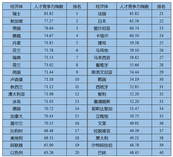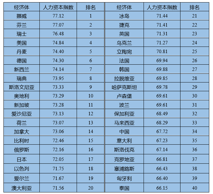 尽管可供使用的数据资源较之前丰富了不少,但依然缺乏国际人才流动分布的确切统计,只好用相近的指标来刻画相关事实。目前比较理想的资料主要是两个:一是世界经济论坛发布的《全球人力资本报告》(The Global Human Capital Report,二是欧洲工商管理学院(INSEAD,也译作“英士国际商学院”)发布的《全球人才竞争力指数》(The Global Talent Competitiveness Index)。世界经济论坛发布的《全球人力资本报告》通过构建系列指标,测度了130个经济体的人力资本指数。该指数由4个一级指标、21个二级指标加权而成。以“能力”一级指标为例,它基于四种常见的受教育程度,按劳动年龄组进行分类测度,这些数据分别反映了至少完成过初等、中等或高等教育的人口比例,以及基本识字和算术水平的人口比例。