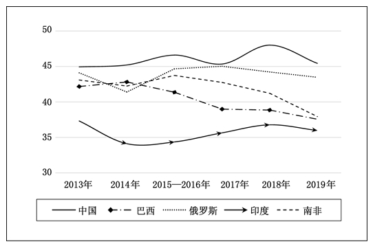 作为世界经济增长的重要引擎,金砖国家自然备受关注。但从2013―2019年人才竞争力指数的演变情况来看,金砖国家在人才队伍建设和人才制度设计等方面还有大量工作要做,特别是印度、巴西和南非,人才竞争力指数呈现出下滑迹象,中国和俄罗斯的人才竞争力指数虽有波动,但总体上能维持在较高的水平(图1所示)。在人才竞争领域,中国和俄罗斯是离发达国家最近的新兴经济体。