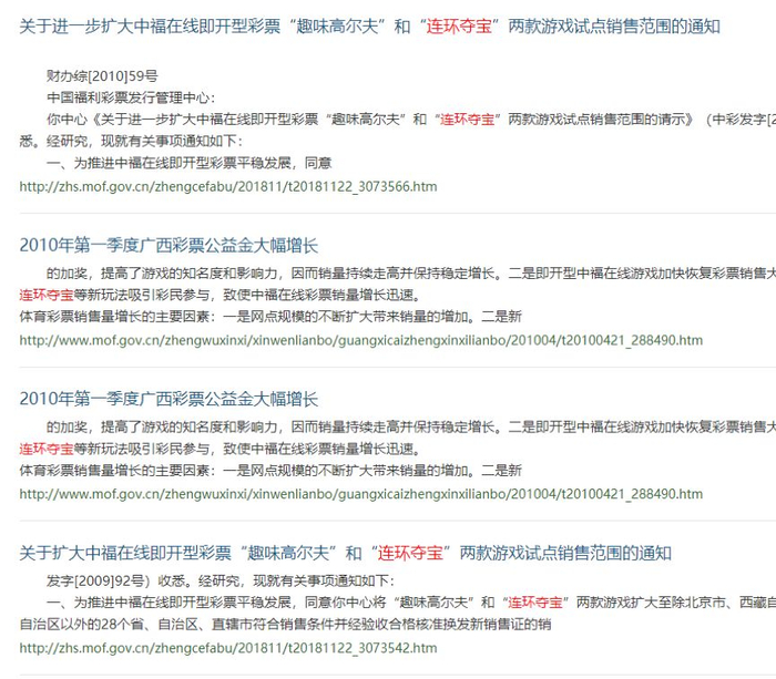 财政部也因此多次批准扩大了“中福在线”的“连环夺宝”等游戏的“试点销售范围”。2012年10月17日刊登在财政部官网上的一份“财办综〔2012〕84号”的文件附件就显示,当时的试点已经扩大到全国27个省市自治区和直辖市,试点营业厅共198个,配置的“中福在线”终端机为4490台。