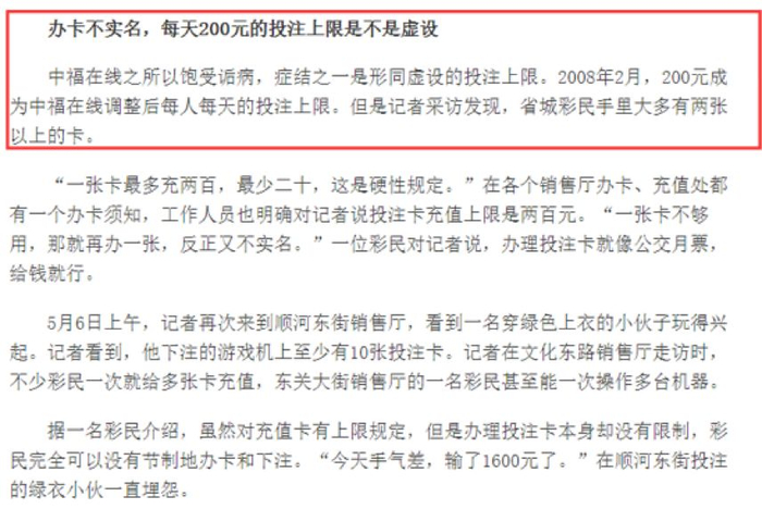这篇报道中最值得注意的地方有两个:一个是尽管福彩中心的官员们当年曾对新华社宣称“中福在线”的管理“规范”、“很难造假”,《生活日报》记者看到的实际情况却是,“中福在线”的每天200元的充值卡购买上限,并没有被营业厅所遵守,甚至多家营业厅也没有履行实名办理充值卡的要求。