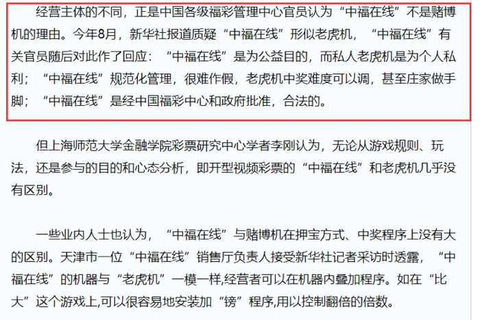 但这些报道的内容,与13年前的媒体报道并无太大不同。“中福在线”一方“一如既往”地宣称,他们有“限额规定”,成瘾是因为个人自控能力差。专家们倒是比10多年前谨慎了些,没人直接说“中福在线”与“老虎机”类似,但也指出“中福在线”那些限额等规则的落实,难以被具体监管。