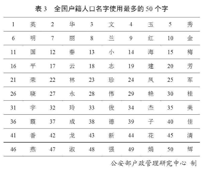 全国户籍人口中,名字使用频率最高的50个字依次为: