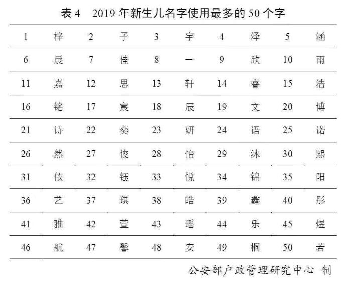 2019年出生并已经进行户籍登记的新生儿名字中,使用频率最高的50个字依次为:“梓”“子”“宇”“泽”“涵”“晨”“佳” “一”“欣”“雨”等。