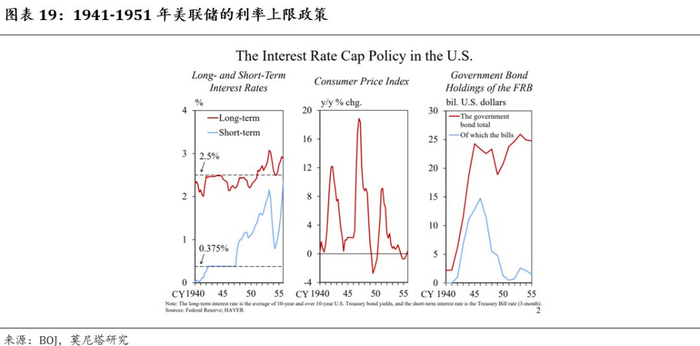 美国曾在上世纪30年代大萧条时期和二战期间实行过类似MMT的政策。彼时罗斯福总统为了刺激经济,实行了雇佣失业工人进行基础设施建设、对家庭转移支付等政策,随后的第二次世界大战又导致财政支出的进一步扩张,美国未偿还国债占GDP的比重从1929年的16.19%大幅上升至1946年的118.4%(图表17)。为了配合财政的刺激,美联储一方面吸纳了大量国债,持有的政府债券规模大幅上升(图表18);另一方面实行收益率曲线控制政策,对长期和短期债券收益率设定上限(图表19)。