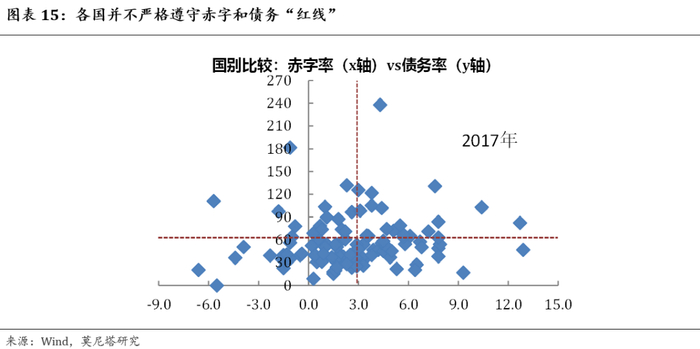 首先,历史经验显示,赤字与债务红线并未被严格遵守。虽然3%和60%通常被认为是赤字率和债务率的红线,但是,红线之外的国家不在少数。IMF数据显示,2017年赤字率超过3%的国家占比接近40%(44/112),债务率超过60%的国家占比大致是33%(37/112)。日本的债务率持续在红线以上,甚至超过了235%(图表15)。