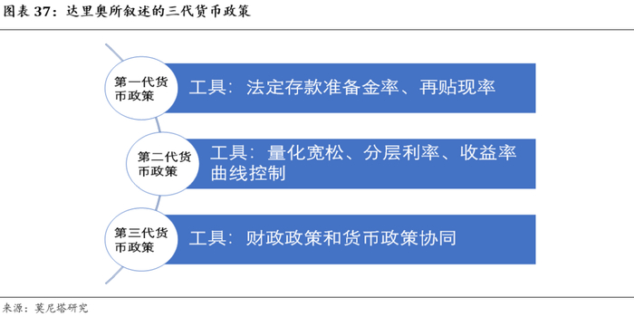 桥水基金创始人达里奥表示:第一代货币政策是降低利率;第二代货币政策是量化宽松;在这两种货币政策无法刺激经济的情况下,MMT倡导的财政和货币协同将会是第三代货币政策(图表37)。
