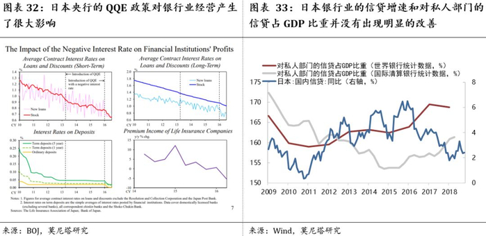 日本央行的QQE和负利率政策对日本银行业造成比较大的伤害,信用派生大幅削弱(图表32),日本银行业信贷增速、以及对私人部门的信贷占GDP比重并未明显改善(图表33)。这表明日本央行的货币政策传导渠道并不通顺,对经济产生的提振作用并不大。同时,日本央行进一步降息和QE的空间已经非常得小,再加上今年10月份上调消费税对经济产生的负面作用,在这种情况下,未来日本在财政政策上的发力依然可以期待。日本政府2019年的预算案超过了100万亿日元,预计2020年的金额会继续上升,具体金额会在今年12月20日左右公布。