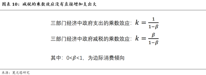 效率约束可以从三个方面来理解:1)如果财政增加支出,一是财政支出增加会对私人部门投资形成一定挤压;二是在一些国家,基础设施已经比较完善,这时候大规模的铺开基建会导致资源的浪费;三是如果大规模基建超过人口的增长,可能导致大量“鬼城”出现;2)如果财政选择减税,一是减税并不能无限制地减下去,存在一个界限;二是减税对经济的影响存在漏损,其乘数效应没有直接增加支出大,且减税对经济的影响存在边际递减,也会造成效率损失(图表10);3)用财政支出来代替私人支出,实际上相当于用政府的行政命令代替市场,可能导致“政府失灵”问题。