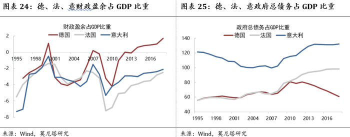 这一表述也正折射出目前欧元区财政扩张面临的困境:按照《马斯特里赫特条约》的规定,一国财政赤字占比不能超过3%,因此目前有能力实行大规模财政扩张的国家只有德国,其他如法国、意大利等国的政府债务与财政赤字占GDP的比重均已较高(图表24、图表25)。但是,德国实行财政扩张也会受到欧元区结构性矛盾和法律的限制:1)首先,德国财政刺激会产生很大的溢出效应,对德国经济的影响可能是不确定的。这是因为,欧元区内除了土地之外,所有生产要素都是可以自由流动的,举一个简单的例子:如果在中国进行大规模财政刺激,工人赚了钱可以拿去消费,进而对国内经济产生乘数作用;但在欧元区,劳动力可以完全自由流动,工人可能并不是德国本国居民,这样财政刺激对德国国内经济的乘数作用就会变小,反而对欧洲其他国家有溢出效应。如果德国出台政策限制只能雇佣德国本国工人,又会带来很多政治上的问题。2)其次,欧元区内统一的货币意味着德国财政对其他国家的赤字存在隐性担保。这一点在欧债危机中表现的很明显。危机期间德国为欧洲金融稳定基金付出超过2000亿欧元,占到了2011年德国GDP的1/12,这种救助毫无疑问会缩减德国财政的空间。因此,实际上德国财政的空间并没有表面数字看上去的那么大。3)即使德国放弃平衡预算,财政空间仍受到《新债务限额》法案的限制,联邦政府只可以增加占GDP0.35%的债务,而要修改这一制度,必须在议会两院获得三分之二的多数票通过,在目前德国国内政治生态分裂的情况下,议会通过的可能性非常小。