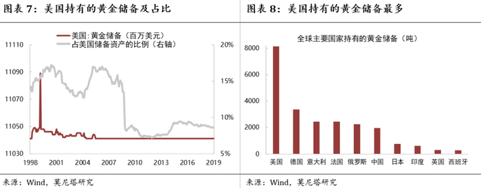 其次来看第二个前提,即政府和货币的主权问题。政府主权毋庸置疑,现今全球大部分国家的政府主权都是独立的。但问题在于货币的主权可能并不是完全独立的,可以从两个角度来理解这个问题:第一,在现今全球经济下,一国货币发行的规模不可能只由国内因素所决定,汇率会是影响货币供给的重要变量之一;第二,一国货币的币值往往需要有以美元为核心的外汇储备来做支撑,也就是需要借助于美元信用,因此便不可能拥有完全的货币主权。美国的情况稍好一些,但依然留有大量的黄金储备,从上世纪90年代开始,美国一直持有110多亿美元的黄金储备,在全球主要国家中持有最多(图表7、图表8),因此即便是美国也不存在完全意义上的货币主权。