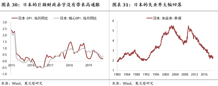 尽管日本首相安倍晋三、财长麻生太郎、央行行长黑田东彦都对MMT理论给予了否定的看法,但是在MMT的支持者眼中,日本是践行该理论的成功案例。在MMT理论看来,日本拥有主要国家中最高的政府杠杆率,但巨额的财政赤字并没有带来高通胀和高利率,日本失业率则已经回落至1990年代的偏低水平,这都是MMT理论的成功运用(图表30、图表31)。
