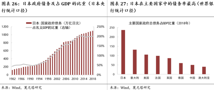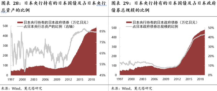 上世纪90年代初,日本泡沫经济破灭,为了刺激经济,日本政府实行了非常宽松的财政政策。截至2018年,日本政府债务超过1000万亿日元,占GDP的比重超过200%,远远超过其他国家(图表26、图表27);日本央行持有的政府债务接近500万亿日元,占日本央行总资产的比重达到84.33%,占日本政府债务总规模的比重达到43.41%(图表28、图表29)。