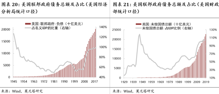 美国也面临着提高联邦政府债务上限的问题。目前的债务上限是2017年12月9日制定的,规模为20.456万亿美元,今年3月份已经触及了这个上限(图表23)。如果无法解决这一问题,那么将面临着政府关门的问题。而现代货币理论正好为提高政府债务提供了理论基础,因此得到了很多人的支持。今年7月25日,美国国会通过2020和2021两个财政年度的联邦政府预算案,大幅提高了联邦政府支出上限。根据预算案,自今年10月1日开始的2020财年,联邦政府自主性支出从本财年1.32万亿美元升至1.37万亿美元;2021年9月30日结束的2021财年,联邦政府自主性支出小幅攀升至1.375万亿美元。预算案同时延长美国财政部的发债权限至2021年7月31日,即2020年总统选举结束后近9个月,这让联邦政府直至明年总统和国会选举结束都不用担心债务违约。另外,特朗普也在酝酿着二次减税。因此,未来美国财政支出进一步扩张是比较大概率的事件。