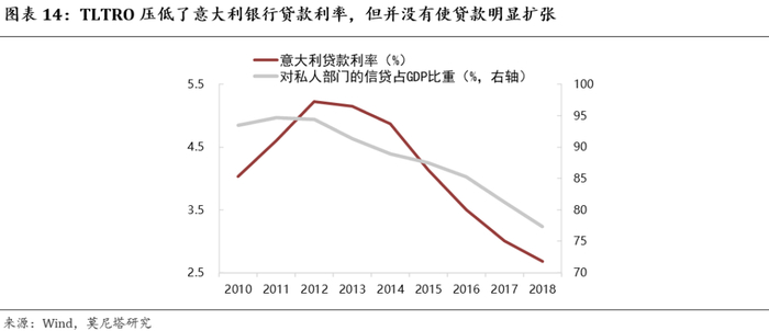宽松货币政策对一国经济的刺激作用降低,这种现象不仅仅体现在降息等常规货币政策中,非常规货币政策同样存在。典型例子是欧央行在2014年开启的TLTRO操作。当时,欧央行为商业银行发放了为期4年的低息贷款,鼓励商业银行向实体经济提供除房贷以外的资金。但根据欧央行工作论文的研究:一方面,TLTRO确实改善了商业银行的经营环境,有利于缓解银行业的风险;但另一方面,TLTRO对实体经济的影响却不大。具体而言,对于脆弱国家,TLTRO使得贷款利率下降了113BP,但并没有带来贷款总额的上升,主要原因在于下游需求没有出现改善(图表14);对于不弱国家,TLTRO使得贷款利率下降50BP,贷款总额确实出现扩张,但实证研究表明,这些国家银行贷款扩张主要原因在于外需回升,与TLTRO并没有显著相关关系。这就表明非常规货币政策对欧元区经济的刺激作用并不高。