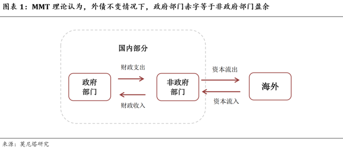 其次,关于财政赤字。1)主权政府在主权货币制度下,借入本币债务不会引发政府破产,因此,财政赤字是可以没有边界的,财政平衡也就没有实际意义;2)在外债规模不变的情况下,政府部门的财政赤字等于非政府部门的盈余(图表1)。