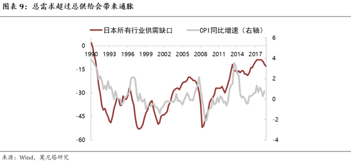 但问题的关键在于:1)自然失业率处在什么水平上本身就存在很大争议,很难界定一个充分就业的界限;2)不同部门不同行业之间也会有很大差别,有时候一个部门已经实现了充分就业,但另一个部门还没有;3)经济下行有时候是因为供给不足导致而非需求不足导致。因此,很难去控制财政的规模恰好达到充分就业的状态,这就使得财政扩张往往会带来通胀压力。以日本为例,供需缺口与CPI同比增速是很明显的正相关关系(图表9)。