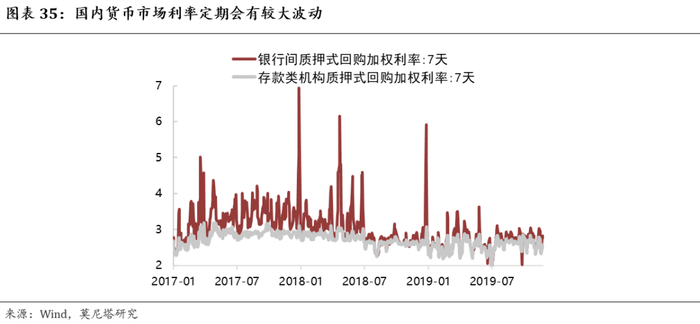 (1)财政收支会对货币市场利率产生影响。财政部一般在中央银行会开设账户,税收、发债、财政支出等均通过这个账户来进行。因此,财政收支活动便会直接对中央银行账户余额产生影响,进而影响到货币市场的利率。典型的例子便是,由于国债缴款和缴税的原因,我国货币市场利率一般会在月末、季末或者年末出现比较大的波动(图表35)。