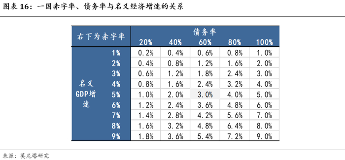2)两个指标的红线设定隐含了名义经济增速假设,而经济增长中枢会动态调整。如果假定一国债务风险可控意味着债务率不无限攀升,即计入当期赤字后的新债务率不高于原债务率,那么只需要“赤字率<债务率*名义经济增长率”即可(图表16)。但是,欧盟所规定的3%的赤字率红线和60%的债务率红线只是一个静态数值,并没有考虑到名义经济增长率的动态变化。