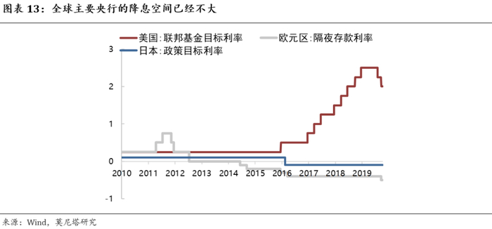 全球三大央行的降息空间均已不大:美联储目前的基准利率是1.5%-1.75%,降息空间仅有150BP;欧央行与日央行已经是负利率,欧央行的隔夜存款利率为-0.5%,日本央行的政策目标利率为-0.1%,若进一步降低负利率,将会对银行业的经营造成很大不利影响;若实行分级利率,政策效果又会打折扣。因此,发达经济体继续降息的空间已经不大(图表13)。