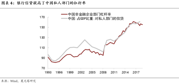 (2)可以缓解资产泡沫与金融风险。央行如果在二级市场购买国债,可能催生债券价格和股票价格的泡沫,在一级市场上则不存在这个问题。另外,商业银行的信贷投放会产生信用风险,严重的可能危及银行自身的安全,用财政支出来代替银行信贷则不会存在这个问题,这有助于降低私人部门的杠杆率和信用违约风险(图表4)。