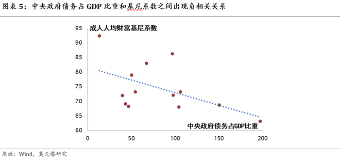 (3)可以通过收入分配效应缩减贫富差距。财政天然具有“自动调节器”的功能,可以通过税收、购买支出、转移支付等手段缩减贫富差距,而央行在二级市场上购买国债导致资产价格上涨,只会拉大贫富差距。另外,银行信贷也是“锦上添花”,一般只会贷给信用条件较好的主体,往往不会“雪中送炭”,这同样会拉大贫富差距。从数据上看,全球主要国家的中央政府债务占GDP比重和基尼系数之间也出现了一定的负相关关系(图表5)。