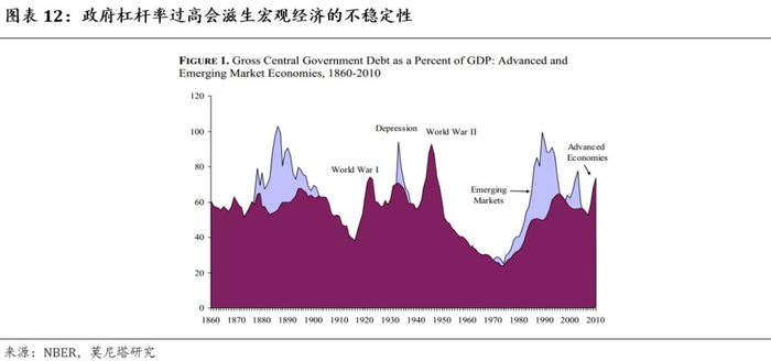 政府过多发债可能会加剧金融风险。国际金融危机后,有经济学家指出政府杠杆率对宏观经济具有破坏作用,政府杠杆率过高既拉低了经济增速,也推升了发生金融风险的概率[1](图表12)。