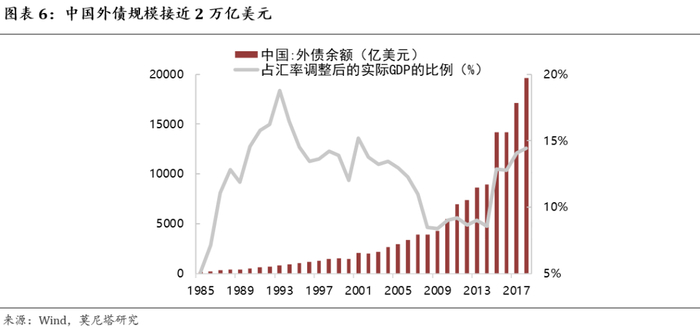 首先来看第一个前提,即政府只能借入本币债务。在实际中,政府不仅仅有内债,还会发行外国债券或欧洲债券借入外币,而这些外币债务是无法通过本币去偿还的[1],而且外债和内债必然不是独立存在的,如果外债发生危机,所产生的效应必然会波及到内债。以我国为例,我国的外债规模从1985年的158亿美元上涨到了2019年6月份的接近2万亿美元,并不是一成不变的(图表6)。