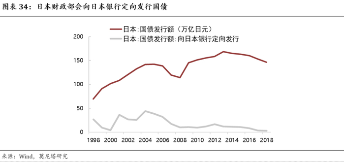 另外,日本与MMT理论最像的一个点还在于:日本财政部会向日本央行定向发行国债,尽管规模不太大,但这实际上就相当于财政赤字货币化(图表34)。