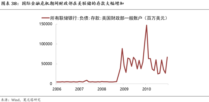 美国财政部和美联储的政策配合在国际金融危机期间表现的尤为明显。国际金融危机期间,美联储向一些问题金融机构注入大量流动性,这些金融机构在偿还债务后,剩余的资金积累在银行体系,形成了大量的准备金,对联邦基金利率形成了很大的向下压力。为了加强对联邦基金利率的控制,一方面,美联储下调了目标利率并卖出国债;另一方面,美国财政部通过TT&L账户将过剩的准备金(尚未转移的税款)转移到美联储账上(图表38),同时应美联储的要求实行了补充融资计划,到2008年10月底,补充融资计划所发行的国债规模达到了5600亿美元[1]。在美联储和财政部的配合下,美国联邦基金利率得到了有效控制。国际金融危机和实行QE政策后,美联储才推出了超额存款准备金利率(IOER),并用利率走廊代替OMO操作来控制联邦基金利率。