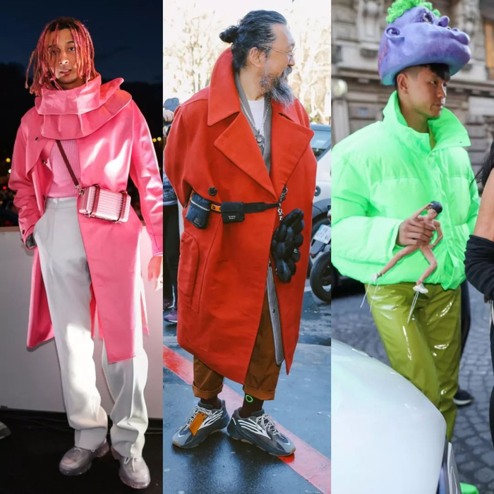今年男装周街拍中出镜率最高就是荧光色,尤其往年被称为「娘了吧唧色」的荧光粉,今年更是在Comme des Garcons、Maison Mihara Yasuhiro等各大男装品牌中成为流行色。