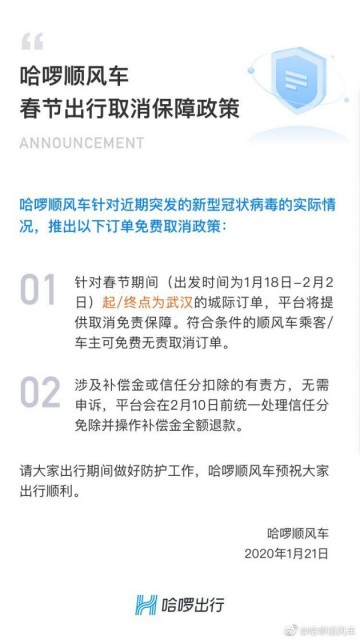 哈啰顺风车针对肺炎疫情声明:武汉城际订单取消免责