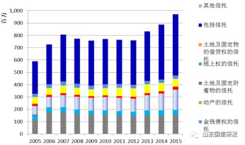 随着日本经济的不断发展,日本信托业规模也不断增加,2005年至2007年增速相对较快,2008年至2012年管理规模保持统一水平,2012至2015年开始了新一轮的快速增长。截至2015年11月末,日本信托行业资产规模为933.3万亿日元(约为51.33万亿人民币)。