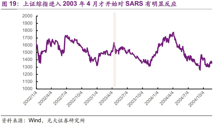 从2002-2003年SARS期间的大盘表现上看,从2002年11月在广东出现疫情开始,随着传染范围逐步扩大,市场却似乎并未对此有明显反应。SARS真正对于股市造成显著影响,是在2003年4月疫情明显加重后,事态引起高层重视,17日中央采取人事任免措施、19日总理明确警告不得瞒报少报实际疫情等一系列举措下,市场转入快速下跌,4月17日-4月25日8日内上证综指从1613.60点下跌到1487.15,跌幅7.84%。