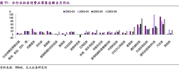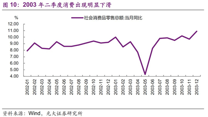 SARS对于消费有临时性的影响,且许多影响集中于爆发SARS疫情的几个城市。随着疫情的发展,人们减少外出,不利于旅游、住宿、餐饮类相关消费。而五一黄金周因SARS疫情被取消,使得2003年5月社会消费品零售总额同比增速相对于4、6月有一个明显下降:2003年5月社会消费品零售总额同比增长4.3%,而4、6月分别为7.7%、8.3%(图10)。