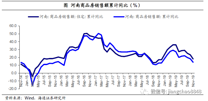 从房地产市场角度来看,19年河南商品房销售额累计同比增速先升后降。15年-16年,河南商品房销售额累计同比增速呈现上行趋势,16年10月全国多个城市先后发布新楼市调控政策,多地重启限购限贷,此后房地产调控政策趋严下,17-18年累计同比增速有所下滑,19年河南省商品房销售额累计增速上行至29%后有所下滑。