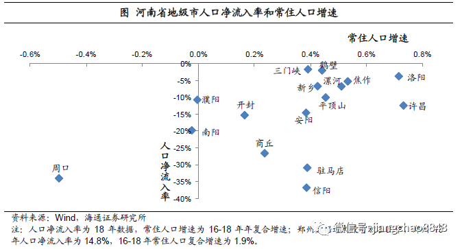洛阳的情况相对较好些,虽然18年仍为人口净流出,但净流出率较低,不到4%,16-18年常住人口复合增速在0.7%以上。许昌常住人口16-18年复合增速也在0.7%以上,在河南各地级市中相对较高,人口净流出率在10%左右。