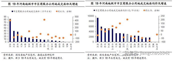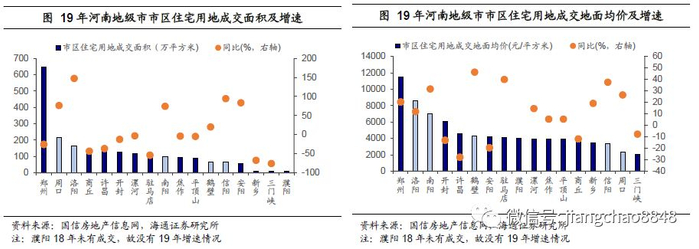 从成交面积来看,超过半数地级市19年成交面积较18年有所下滑,成交活跃度有所下降。19年市区住宅用地成交面积下滑较为明显的有三门峡、新乡、驻马店、商丘以及许昌等,分别下滑75%、67%、54%、43%及36%。另一方面,19年洛阳、周口、信阳及安阳市市区住宅用地成交面积则有明显上升。从成交价格来看,19年大多数地级市市区住宅用地成交地面均价同比上涨,但也有例如许昌、安阳、开封及商丘等成交均价同比下滑。