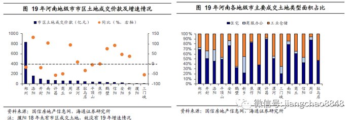 地级市分化,郑州一枝独秀。1)地级市经济总量大致可分为4个梯队。省会郑州18年GDP远远领先,洛阳及南阳处于第二梯队。第三梯队GDP总量相对比较平均,而濮阳、三门峡、漯河及鹤壁经济总量相对靠后。考虑到人口影响,人均GDP方面,18年郑州人均GDP依然远高于其他地级市,洛阳和许昌排名相对靠前,周口、商丘及驻马店在省内较弱,但是同比增速较高,均超过8%。2)除郑州外均为人口净流出。我们通过人口净流出率和常住人口增速来考察各市人口吸引力。郑州人口吸纳力持续增强,18年人口净流入率接近15%,16-18年常住人口复合增速为1.94%。根据 “2018年河南人口发展报告”,外省流入河南的人口中,36.8%流入到郑州市,比2017年提高3.1个百分点,省内跨市流动人口更是有近6成流入郑州市。信阳、驻马店、周口、商丘18年人口净流出率较高,超过25%;周口、南阳、濮阳16-18年常住人口增速为负。洛阳18年仍为人口净流出,但净流出率不到4%,常住人口增速在0.7%以上。其他地级市来看,人口净流出率大概在0-15%左右,常住人口增速多在0.6%以下(除许昌外)。3)综合财力分化明显。郑州市18年综合财力远高于其他地级市,鹤壁及漯河综合财力较弱,均低于300亿元。各地级市财政自给率不算高,其中濮阳、南阳、驻马店、信阳及周口自给率较低。4)债务率总体不高。截至18年末河南省内数据较全的地级市中,鹤壁债务率最高,超过70%。其他地级市均在55%以下,没有特别高的。考虑到城投带息债务的广义债务率,广义债务率超过100%有平顶山、洛阳及开封,其他地级市的债务负担均相对较轻。河南省土地出让情况分析。1)全省土地成交价款增幅稳中放缓。河南省18年国有土地使用权出让收入在政府性基金收入中占比超过八成,是主要的收入来源。19年全省土地成交款与18年基本持平,但市区土地成交价款略有下滑。从价格来看,近三年全省成交地面均价呈现上升趋势,不同类型土地中商服办公用地地面均价在19年有所下滑。从房地产市场角度来看,19年河南商品房销售额累计同比增速先升后降。2)地级市土地出让情况分化。我们主要考虑市区的情况,在经济总量靠前的地级市中,洛阳和南阳19年市区土地成交价款仍维持较高的同比增速,此外,许昌、商丘及三门峡市19年市区土地成交价款降幅较大。从成交土地用途来看,鹤壁、濮阳、三门峡及驻马店市19年市区工业仓储用地面积占比较高,郑州、安阳、焦作、许昌、南阳及周口等住宅用地占比较高。3)不同类型土地情况分析。从市区成交面积来看,3种主要用途的土地19年都有过半数地级市成交面积同比下滑,成交活跃度有所下降。考虑到成交价格因素,19年市区住宅用地量价齐升的地级市主要有周口、洛阳、南阳、信阳及鹤壁;市区商服办公用地量价齐升的仅有三门峡市;市区工业仓储用地量价齐升的主要有鹤壁、平顶山及安阳。