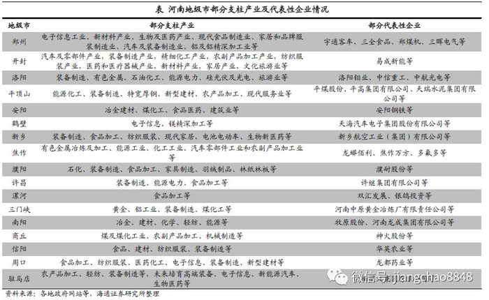 各地级市支柱产业总体以能源化工、食品加工、汽车制造、装备制造、新型材料制造等为主,同时洛阳、开封等市大力发展旅游业。代表性企业有例如平煤股份、洛阳钼业、安阳钢铁、宇通客车、中信重工、牧原股份、三全食品、双汇发展等。