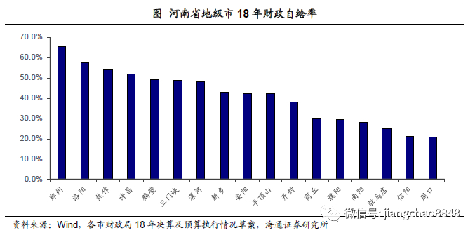 但一般公共预算中税收收入占比较低,财政自给率一般。从财政收入结构来看,18年河南省税收收入占一般公共预算收入比例约为70.6%,处于全国第24位,相对靠后。从财政自给率情况来看,18年河南财政自给率(一般公共预算收入/一般公共预算支出)为40.8%,处于全国中间位置。