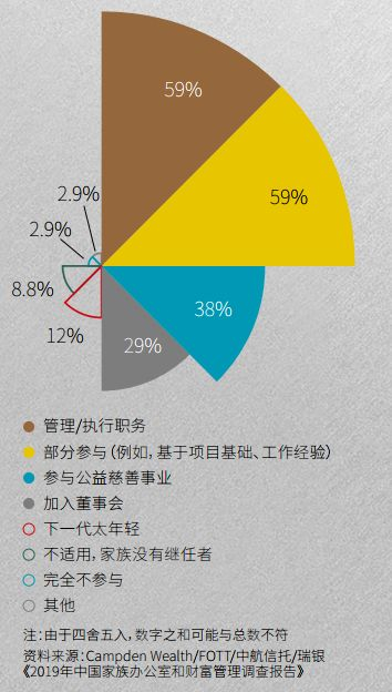 近五分之三(59%)的家族表示下一代会担任管理/执行职务,而29%的家族表示他们会担任董事。59%的家族表示,下一代会在一定程度上参与业务,例如基于项目基准或获得工作经验,只有2.9%的受访者表示他们根本没有参与业务。