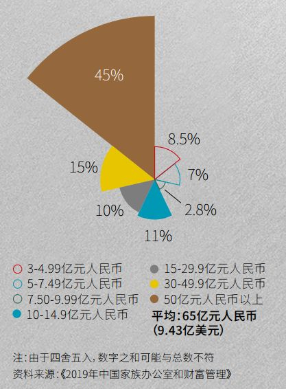 参与报告调研的家族中,有18.5%的家族净财富在10亿元以下,有45%的家族净财富超过50亿元人民币,平均净财富约为65亿元人民币(约合9.43亿美元),家族办公室的平均管理资产规模为42亿元人民币。