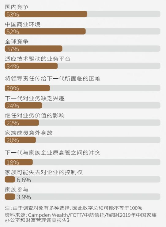 值得关注的是,家族成员意外身故、下一代与家族企业原高管之间的冲突、家族可能失去对企业的控制权等因素并不是受访家族最为担心的问题。