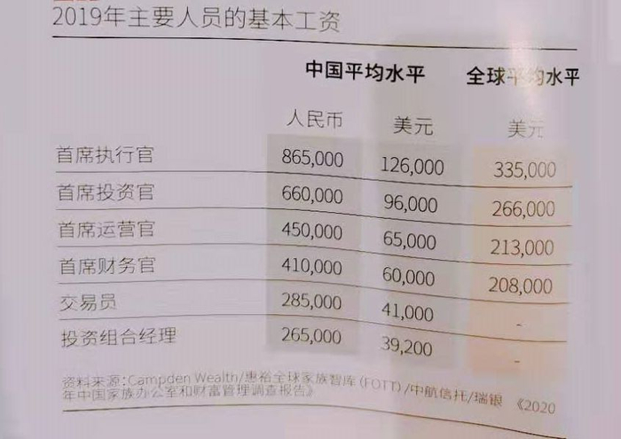 报告显示,中国家族办公室的薪水远低于全球平均水平和亚太区平均水平。2019年,中国首席执行官、首席投资官、首席运营官和首席财务官的平均基本工资为86.5万元(约占全球平均水平的38%)、66万元(36%)、45万元(30%)和41万元(29%)。